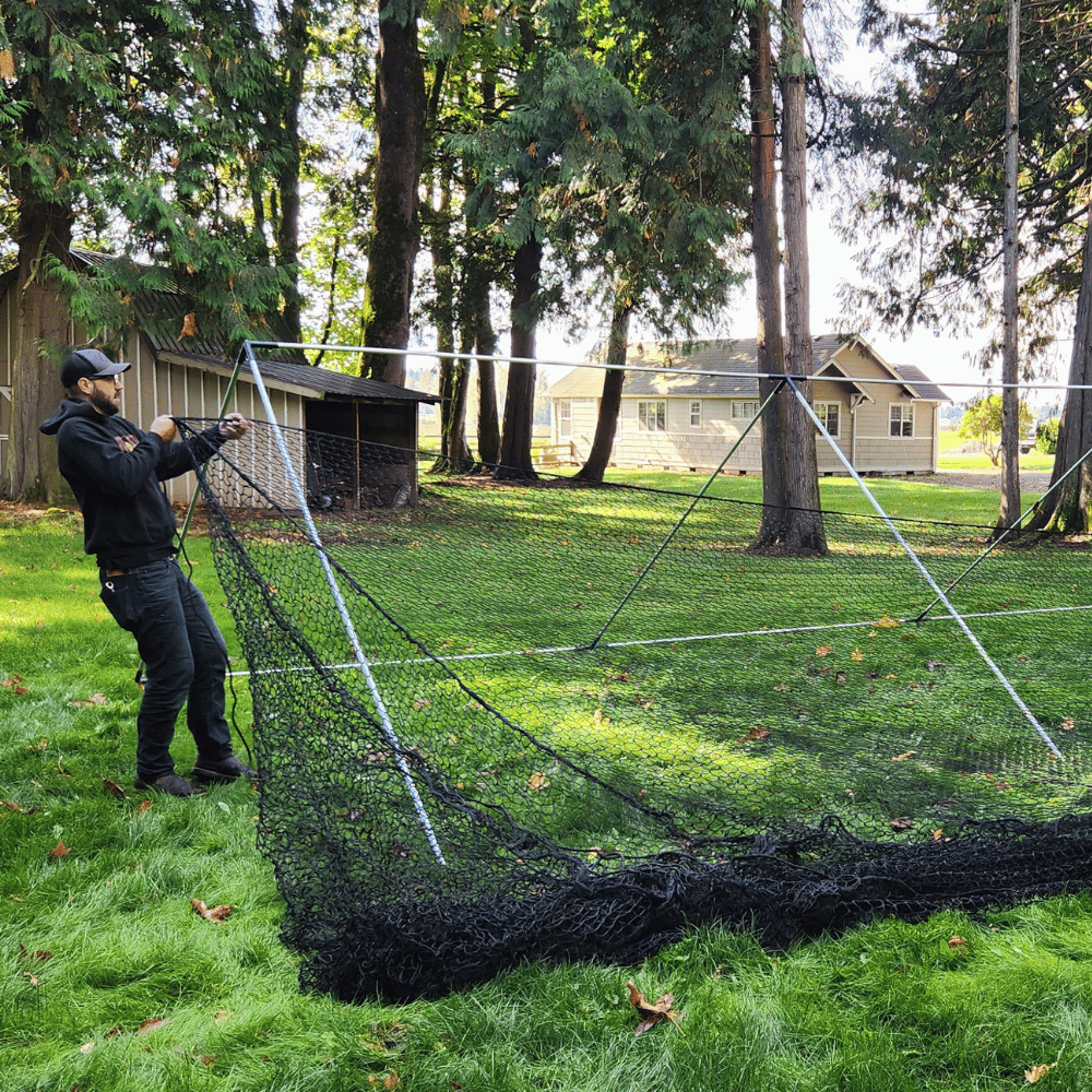 Additionally, our backyard batting cages are DURABLE and will give you years of trouble-free use. Since we started in 1998, none of our clients have had a hole in the net due to hitting nor has the netting deteriorated due to water or UV from the sun. This is due to the unique design we invented and the high quality of knotted nylon netting. The netting is draped over the frame and not attached anywhere to the frame. Because of this, the net can give, there is less wear and tear and abrasion on the net, hence longer life. Even we have been surprised. While we can't say for certain how long your net will last we are hearing that a lot of nets last between 5 and 10 years before some minor repair is needed. The most likely repair is from animals chewing on the net!